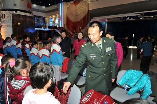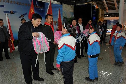 來(lái)到北京航天城 在航天城會(huì)展中心展廳,孩子們第一次見到了從前只能在電視里見到的英雄航天員費(fèi)俊龍。當(dāng)費(fèi)將軍走進(jìn)展廳時(shí),孩子們歡呼雀躍,激動(dòng)的心情寫在紅撲撲的小臉上。孩子們?yōu)橛⑿酆教靻T敬獻(xiàn)紅領(lǐng)巾和莊嚴(yán)的少先隊(duì)隊(duì)禮,以表達(dá)他們對(duì)航天員叔叔崇高的敬意和無(wú)限的敬仰之情。費(fèi)將軍與孩子們親切握手,鼓勵(lì)孩子們要熱愛黨、熱愛人民、熱愛偉大的祖國(guó),要勇敢、堅(jiān)強(qiáng),不怕困難,超越自我,珍惜現(xiàn)在的學(xué)習(xí)條件和所有人的關(guān)心幫助,努力學(xué)習(xí),真正成為中國(guó)特色社會(huì)主義事業(yè)的合格建設(shè)者和接班人!他在講話中表示,通過(guò)這次活動(dòng)能夠?yàn)楹⒆觽儷I(xiàn)上自己的愛心,積極履行社會(huì)責(zé)任,非常有意義。費(fèi)將軍還和國(guó)資委直屬機(jī)關(guān)黨委常務(wù)副書記曾堅(jiān)、企業(yè)改革局局長(zhǎng)白英姿、直屬機(jī)關(guān)工會(huì)主席呂秋菊以及中國(guó)航天科技集團(tuán)公司五院黨委書記李開民一起,把嶄新的學(xué)習(xí)用品送到孩子們手中。