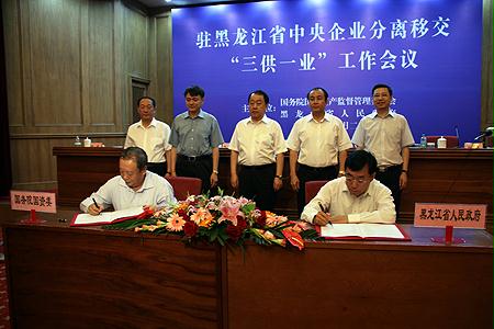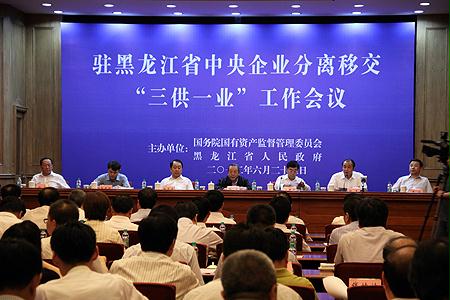 為推進(jìn)中央企業(yè)分離辦社會(huì)職能,做好駐黑央企分離移交“三供一業(yè)”(供水、供電、供熱和物業(yè)管理)工作,6月28日上午,國(guó)務(wù)院國(guó)資委與黑龍江省人民政府在哈爾濱共同召開(kāi)駐黑龍江省中央企業(yè)分離移交“三供一業(yè)”工作會(huì)議。國(guó)務(wù)院國(guó)資委副主任、黨委副書(shū)記邵寧和黑龍江省人民政府副省長(zhǎng)張建星出席會(huì)議并講話。黑龍江省政協(xié)黨組副書(shū)記、省國(guó)資委黨委書(shū)記趙克非和國(guó)務(wù)院國(guó)資委副秘書(shū)長(zhǎng)郭建新出席了會(huì)議。會(huì)議由黑龍江省人民政府省長(zhǎng)助理、省國(guó)資委主任趙杰主持。會(huì)上,哈爾濱市政府介紹了分離移交“三供一業(yè)”有關(guān)政策及經(jīng)驗(yàn);哈電集團(tuán)、中航工業(yè)東安公司、兵器工業(yè)集團(tuán)、國(guó)家電網(wǎng)代表有關(guān)中央企業(yè)作了發(fā)言;國(guó)務(wù)院國(guó)資委與黑龍江省人民政府簽署了《關(guān)于駐黑龍江省中央企業(yè)分離移交“三供一業(yè)”工作協(xié)議》,有關(guān)企業(yè)與接收單位簽訂了《分離移交協(xié)議》。