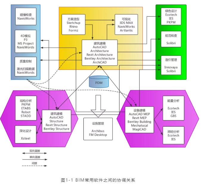 圖1-1中的實線表示數據信息可直接互用,虛線表示數據信息可間接互用,箭頭表示互用數據信息的方向。BIM相關軟件在建設項目的應用,呈現以下幾個特點: