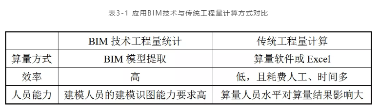 BIM技術在招投標階段成本控制應用主要體現在工程量的快速統計。工程量的計算是項目招投標階段的核心工作。應用BIM技術與傳統工程量計算方式對比見表3-1: