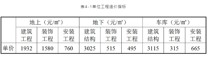 BIM技術在項目初步設計階段的工作主要是前期目標成本的測算,通過BIM初始模型的成本分析指標和數據平臺歷史數據的輔助,利用其工程量快速分析與計算,更準確、更迅速地對目標成本進行測算。結合企業數據庫中類似項目造價指標得到本項目各單位工程造價指標數據如表4-1,并估算本項目的目標成本為1.5億元。