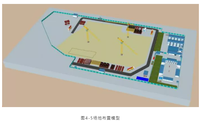 本項目利用廣聯達場布軟件虛擬建造施工現場臨時設施,結合工程進度,通過漫游和模擬安拆時間優化平面布置方案,以預演的方式來發現和解決場地布置中的問題,更加合理的確定道路的規劃和加工場、堆料場、垂直運輸機械的位置,以達到優化整個施工階段的施工資源的配置,避免二次搬運的發生,有效提高工作效率。具體場地布置模型如圖4-5: