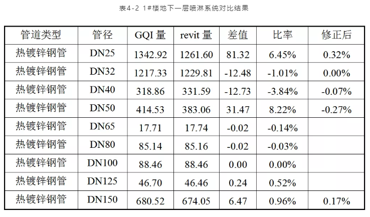 本項目的工程量計算采用BIM算量與廣聯達算量軟件相結合的形式,為了確保工程量的準確性,本項目對BIM算量與算量軟件計算的結果進行了對比,文中僅展示1#樓地下一層噴淋系統對比結果如表4-2所示: