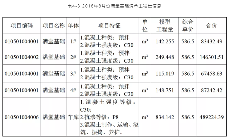 此外,結合BIM5D平臺(以BIM技術為核心的工程項目全過程管理協同平臺,把全專業集成模型為載體,關聯施工過程中的各類信息,為項目提供數據支撐,實現有效決策和精細管理,從而達到減少施工變更,縮短工期、控制成本、提升質量的目的)可以快速出具清單工程量和構件工程量,在計量支付過程中,可根據實際施工進度分樓層、單體或清單選擇提取形式,本文以8月份滿堂基礎為例,BIM5D按單體統計清單工程量信息如表4-3所示: