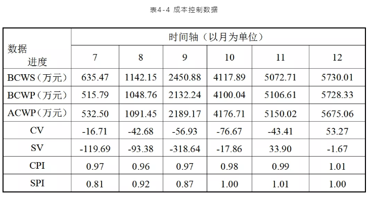 (3)計算進度指標、費用指標。利用掙值法分析直接計算成本進度控制所需要進度偏差(SV)、成本偏差(CV)參數以及進度績效指數(SPI)和費用績效指數(CPI)。具體成本控制數據值如表4-4所示: