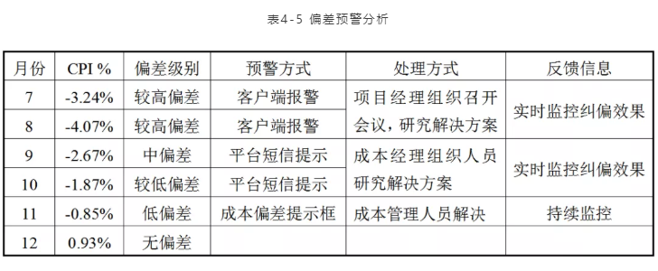 成本偏差率由BIM信息集成平臺自動計算,BIM5D預警體系依據設置偏差預警級別自動選擇預警方式來提示對應的項目管理人員。具體本項目所選取階段偏差預警分析如表4-5所示: