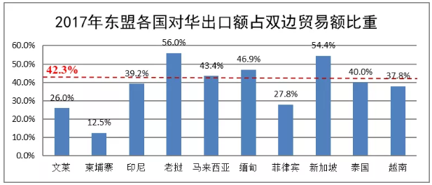 從具體國別看,2017年東盟十國中只有新加坡、老撾對華貿易是順差,其他國家均為逆差,其中柬埔寨對華出口額僅占雙邊貿易額的12.5%,文萊、菲律賓、越南占比相對較低,分別為26%、27.8%和37.8%,印尼和泰國也低于42.3%的平均水平。