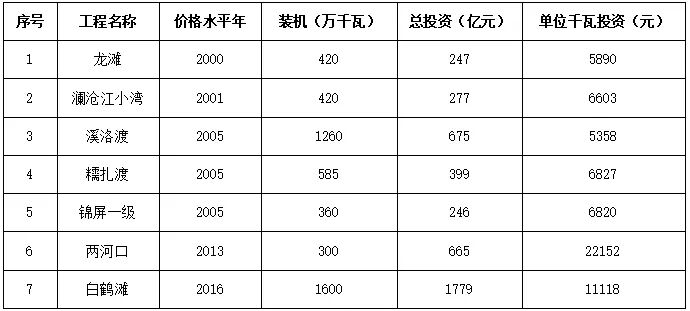 篩選我國2000年以來開工建設符合調節庫容≥50億立方米;調節性能≥年調節;裝機規模≥100萬千瓦三個條件的水電站,工程投資情況見表1。