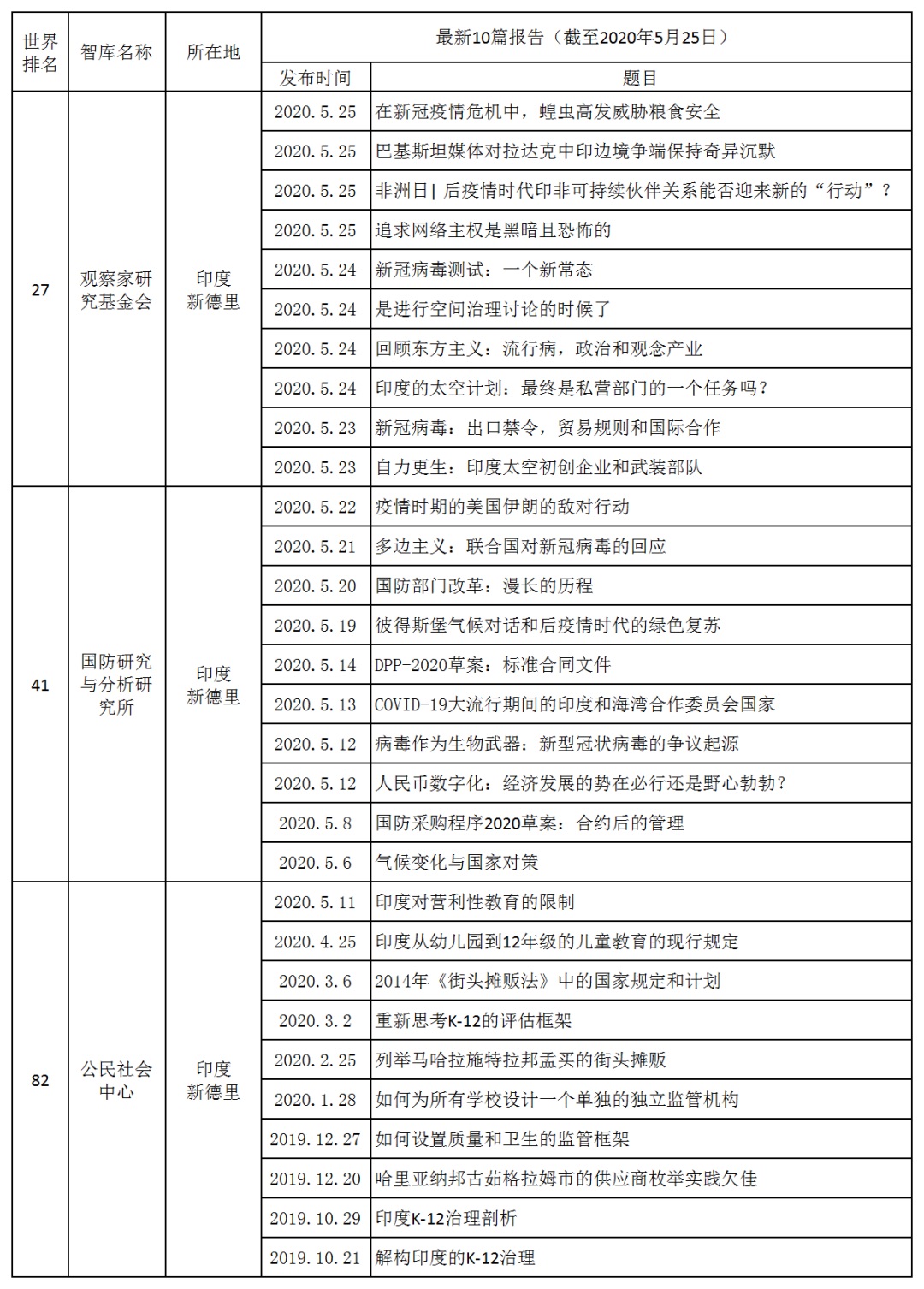 表5 印度排名前三智庫2019年10月至2020年5月的最新研究成果