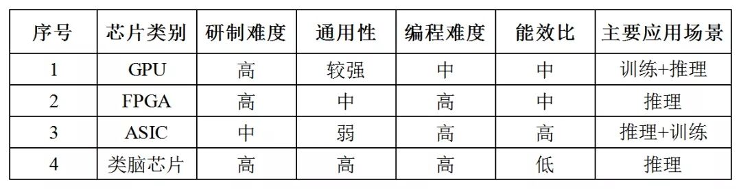 不同類型的芯片在通用性、應用兼容性、編程難度、性能、能效比等方面具有各自的優(yōu)缺點,適用于訓練、推理等不同的應用場景。不同類型AI芯片的特征和優(yōu)缺點如表1所示。
