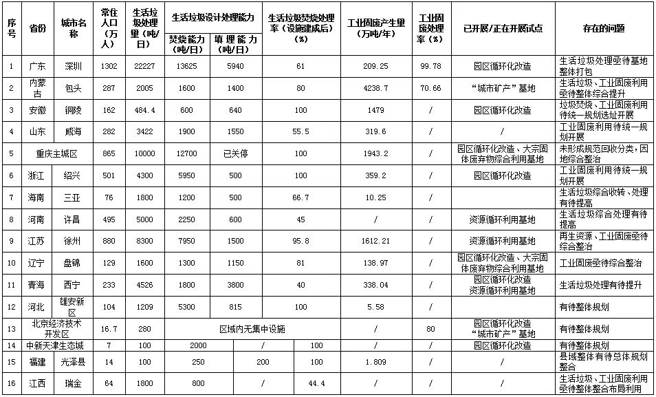 摘要 “無廢城市”與“兩型基地”均為國家批復的固廢綜合管理領域的相關試點,通過“兩型基地”的建設,將在“無廢城市”的建設中形成聚焦模式,推動城市總體規劃、固廢產業項目選址落地、固廢回收體系融合搭建、固廢綜合利用與安全處置等,形成自上而下的總體布局和建設模式,有助于破解城市“垃圾圍城”,推動固廢綜合利用,促進環保產業發展,從而助力成功建設“無廢城市”,提升城市綜合管理水平與生活品質,形成綠色發展模式。 關鍵詞:無廢城市;兩型基地;固廢綜合利用;綠色發展 引言 我國固體廢物歷史堆存量約600~700億噸,每年新增的固體廢棄物近100億噸。新增固廢量居高不下,歷史存量消化困難,將導致大量工業固廢的露天堆積,對土地、地下水等各方面造成嚴重環境危害,并不斷蠶食侵占城市的發展空間,固體廢物的消納利用成為了當前城市發展的“當務之急”。 生態環境部公布的《2019年全國大、中城市固體廢物污染環境防治年報》顯示,2018年我國200個大中城市一般工業固廢產生總量達15.5億噸,但只有8.6億噸實現利用,利用率僅為55.48%。2018年我國生活垃圾清運量為2.28億噸,同比增長5.56%。隨著城市化進程的加快,我國生活垃圾清運量將持續擴大,預計2023年將超過3億噸,生活垃圾的分類回收與處理壓力將持續增大。 固體廢棄物處理散亂、固體廢物去向不明、綜合利用與集中處置能力不夠、標準體系不健全、技術支撐不足等問題不同程度的存在,使固體廢物污染防治成為綠色發展中的短板。在綠色發展、生態優先、循環帶動成為發展共識的現今,如何推動城市綠色發展,成熟應對廢棄物產生與處理問題,將是破解“垃圾圍城”,形成綠色發展的關鍵。 固體廢棄物資源化利用是破解固廢污染防治難題的有效途徑。固廢資源化利用將有效緩解資源瓶頸現狀,成為資源來源的重要補充。我國大宗礦產、石油、天然氣等資源對外依存度較高,鐵礦石、銅、鉀等對外依存度超過50%,原油對外依存度高達72.3%。經測算,每回收利用1噸再生資源可以節約自然資源4.12噸,標準煤1.4噸,減少6~10噸固廢處置。2018年我國回收利用再生有色金屬1110萬噸,占有色金屬產量的19.4%。預計到2030年,我國通過固廢資源化可新增再生銅607萬噸、鋼鐵4.7億噸,替代約25%的原生資源量。此外,固廢資源化利用對于二氧化碳和污染物減排具有非常顯著的效果。與原生產品相比較,再制造產品可節約成本50%、能耗60%、原材料70%,減少污染排放約80%。 近年來,我國出臺了一系列政策推動“無廢城市”“兩型基地”的建設,其核心是推動城市固廢資源化利用,實現綠色發展。本文首先梳理“無廢城市”建設現狀和存在的問題,然后分析“兩型基地”對于實現“無廢城市”的重要作用和建設現狀,最后提出進一步發展“兩型基地”助力“無廢城市”建設的政策建議。 一、“無廢城市”建設現狀與問題 “無廢城市”是貫徹習近平生態文明思想,立足于創新、協調、綠色、開放、共享的五大發展理念,致力于打造綠色生產生活方式,實現安全處置固體廢棄物,降低其對生態環境的影響,并進行源頭減量和資源化利用的一種城市發展方式。2018年國務院辦公廳印發了《“無廢城市”建設試點工作方案》(國辦發〔2018〕128號),提出“無廢城市”建設理念,“探索建立‘無廢城市’建設綜合管理制度和技術體系,大宗工業固體廢物貯存處置總量增長趨零,主要農業廢棄物全量利用,生活垃圾減量化,資源化水平全面提升,危險廢棄物全面安全管控……,培育一批固體廢物資源化利用骨干企業。”要在全國范圍內選擇有條件、有基礎、規模適當的城市開展試點工作。 一年多來,“無廢城市”的理念逐步得到了各方的認同,生態環境部開展試點的11+5個城市和地區按計劃推進,其中12個城市和地區已經或者正在開展國家發展改革委組織的園區循環化改造、“城市礦產”基地、資源循環利用基地、大宗固廢綜合利用基地等的建設。通過分析試點城市固廢利用種類和數量發現,“無廢城市”試點亟待布局和建設“兩型”基地,以完善整體試點打造,見表1。 “11+5”無廢城市試點建設中,由于城市水平各異、能力各異,建設情況差異較大,在總體建設布局、生活垃圾回收體系、生活垃圾處理、行業固廢綜合利用、信息共享等方面存在一些問題。 在總體建設布局方面,雄安新區規劃處理能力、技術路線明顯較優;北京、天津兩開發區由于區域內人口及面積所限,大多采用區域協同、小型分散處理的方式,但無害化水平均相對較高;地方縣、縣級市垃圾集中處置水平有待提升。部分地方如盤錦市已經規劃建設盤錦市再生資源產業園和遼東灣新區再生資源產業園兩個再生資源產業園區,光澤縣計劃不斷完善城市垃圾填埋、餐廚垃圾處理、建筑垃圾處理場、一般工業固廢處理、報廢機動車拆解、污泥生產生物質顆粒燃料、建筑垃圾、礦山廢石生產機制砂等項目建設,但項目是否呈現集中化、園區化仍待商榷。 在生活垃圾回收體系方面,深圳、天津新區分類較為精細,而普通城市、縣級地區垃圾分類工作與分類標準、原則相對較為滯后。 在生活垃圾處理方面,深圳、西寧、紹興、許昌等地垃圾填埋場已經告急,目前已規劃或在建垃圾焚燒項目、餐廚廢棄物綜合處理項目。但是,由于公眾對二噁英等氣體排放的隱憂,鄰避效