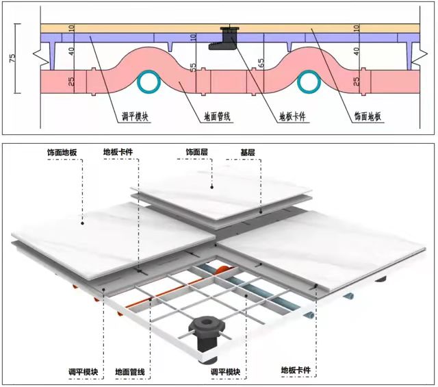 由調節支腳和架空格柵組成的調平模塊空腔中不僅可以敷設管線,而且縮短了架空高度,節省了室內空間,實現管線分離;飾面地板模塊單獨可拆卸,實現設備和管線的可視化,便于后期設備和管線的檢修及更換,參見下圖。若選用地暖采暖,干法樓面可以組合采暖模塊,在架空格柵上直接安裝地暖模塊,并可直接敷設飾面地板,導熱快速。