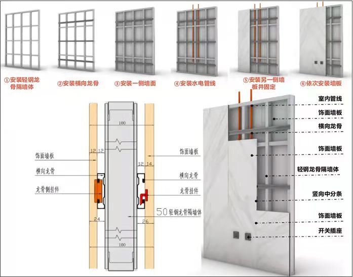 實施方法以輕鋼龍骨內墻隔板為例,整個內隔墻體系由輕鋼龍骨隔墻體,橫向龍骨,飾面材料組成,敷設管線時,可在輕鋼龍骨隔墻體空腔中安排布置,不受傳統點位布置的局限。