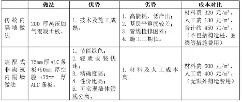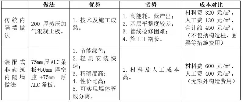 傳統內隔墻常用材料為多孔磚、混凝土砌塊及石膏龍骨隔墻等。裝配式內隔墻板主要包括ALC板(Autoclaved Lightweight Concrete,蒸壓加氣混凝土板)、輕鋼龍骨內墻隔板等,其中ALC板中間為空心,成品板材工業化生產、現場拼裝,其施工效率是傳統磚砌體的4~5倍,取消了現場砌筑和抹灰工序;輕鋼龍骨內墻隔板可根據實際需要采用纖維石膏板或硅酸鈣板,管線通過龍骨來實現分離。