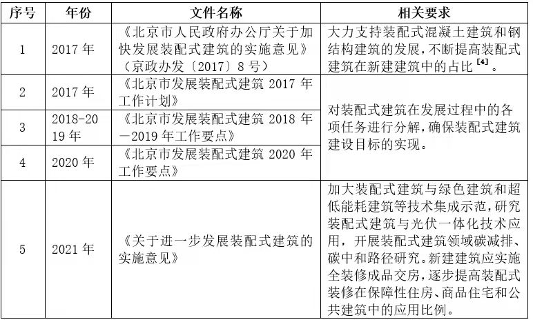 2021年上半年,全國各地裝配式建筑發展目標及扶持政策匯總共有100余條。以北京市為例,自2017年以來,逐年發布各類發展裝配式建筑的相關政策文件,大力支持發展并不斷提高裝配式建筑在新建建筑中的占比。相關政策文件如下[3]: