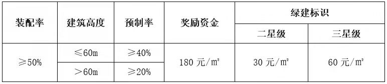 注:單項目獎勵金額最高不超2500萬元。已享受獎勵的裝配式項目,另外取得綠建二星級、三星級標識的,增加獎勵金額。達到相對應的綠建星級后,單項目再獎勵金額最高不超500萬元。