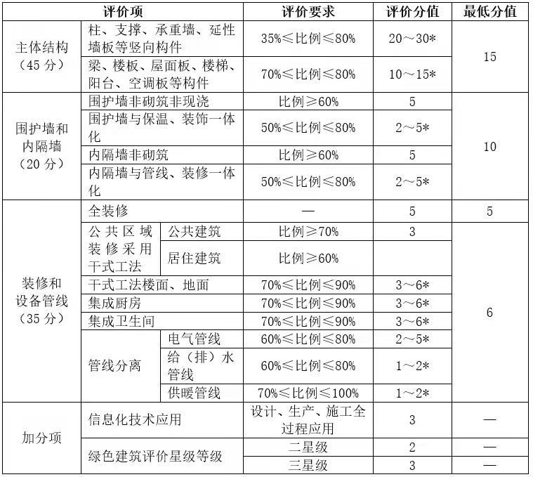 為在建筑領域貫徹落實創新、協調、綠色、開放、共享的發展理念,加快推進建筑業生產方式轉變,促進北京市裝配式建筑發展,規范裝配式建筑評價,自2021年7月1日北京市開始全面執行《裝配式建筑評價標準》(DB11/T 1831-2021)。該標準適用于北京市行政區域內民用建筑的裝配化程度評價。建筑項目在考慮裝配式建筑技術應用時,可根據標準中四大類、十四個評價項的評價要求和評價分值進行選擇。詳見下表: