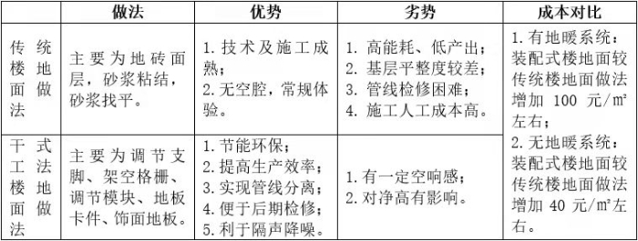 傳統樓面做法為濕法鋪攤砂漿施工方法,包括找平層、結合層、水泥砂漿粘貼面磚等多道工序,必要的管線將敷設其中。干式工法樓面做法采用架空自調平地面支撐系統,配合復合地面裝飾材料,如地板、干法地磚等。干式工法樓面設置地面檢修口,內部的架空層可用于安裝各類管線,達到管線與主體樓地面結構分離。
