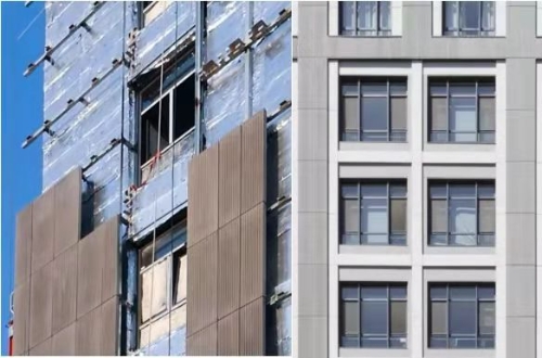 通過技術的不斷發展和革新,同一種外墻掛板材質,也可以通過自身機理和顏色的不同打造豐富而有質感的立面效果。ECP板按照表現加工工藝分為清水飾面板、表面涂裝板和基層板材。寬度規格為500~600mm,生產長度規格為5m。ECP裝配式外墻安裝構造,內墻是ALC墻板,外做巖棉保溫,覆防水透氣膜,空氣層外掛ECP板。面板可以制成不同的肌理效果,并且飾面顏色選擇多樣化。