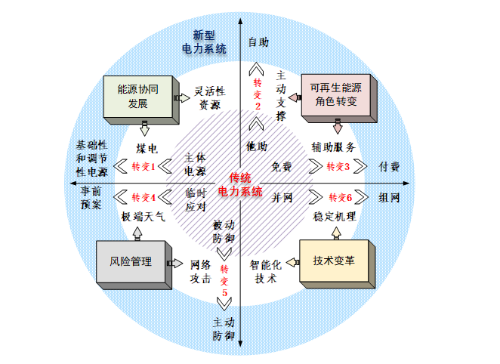 三、對策建議:實現“六個轉變” 總的來看,2030年之前,由于可再生能源比例相對較低,且煤電等電網友好型電源還發揮著基石作用,電力系統安全穩定運行的風險相對可控。2030年之后,隨著碳中和進程加快,可再生能源占比持續上升,與此相關的風險和挑戰也將大幅上升。需提前做好認識和行動的準備,堅持居安思危、未雨綢繆、系統施策,做到“六個轉變”(見圖2),保障電力系統安全穩定運行。