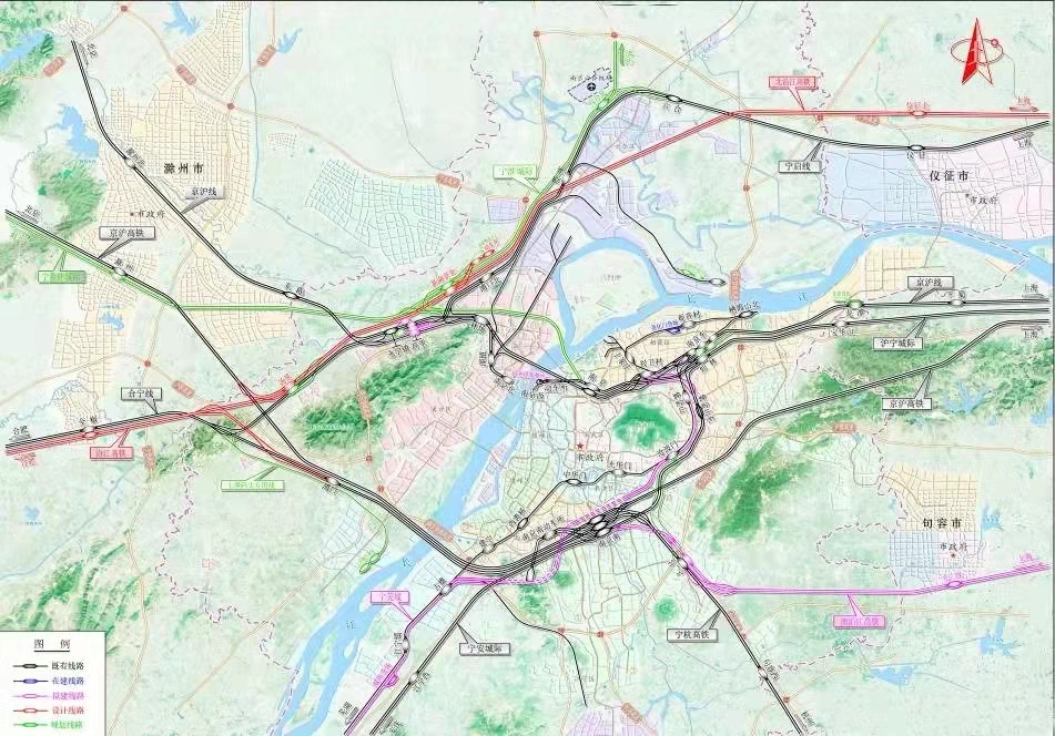 為了充分發(fā)揮高速鐵路客站分工明確、區(qū)域布置合理的原則,根據(jù)南京鐵路樞紐總圖規(guī)劃,樞紐將形成南京、南京南、新南京北站為主客站的客運(yùn)格局。因此,沿江高速鐵路引入南京樞紐時(shí),不僅要充分考慮緩解既有客站能力緊張問(wèn)題,而且要從城市總體規(guī)劃和客站地理位置角度,論證新建第三主客運(yùn)站的可行性。結(jié)合旅客運(yùn)輸需求、既有客站布局以及城市規(guī)劃等因素,從客站能力適應(yīng)性角度分析認(rèn)為,隨著合寧鐵路、沿江高鐵、蘇南沿江城際及寧淮、寧滁城際鐵路的引入,南京樞紐近遠(yuǎn)期辦理客車(chē)總對(duì)數(shù)分別達(dá)到780對(duì)/日和959對(duì)/日,既有客站能力均難以適應(yīng)近遠(yuǎn)期旅客列車(chē)運(yùn)輸需求,且不具備改擴(kuò)建條件;從客站地理位置角度分析,南京、南京南站均位于江南地區(qū),江北地區(qū)尚無(wú)主要客站,若新建客站位于江南地區(qū),則江北各條線(xiàn)路間的跨線(xiàn)列車(chē)均需繞行至江南,運(yùn)輸徑路不暢,新建客站宜選擇在江北地區(qū);從城市規(guī)劃角度分析,南京市江北地區(qū)為城市副中心及國(guó)家級(jí)新區(qū),對(duì)南京在長(zhǎng)江經(jīng)濟(jì)帶核心地位的提升和南京都市圈輻射能力的增強(qiáng)具有重要作用,在江北地區(qū)建設(shè)大型客運(yùn)樞紐將大大提升江北國(guó)家級(jí)新區(qū)的區(qū)位地位,提升江北地區(qū)公共服務(wù)能級(jí),構(gòu)成雙向互動(dòng)的“擁江”發(fā)展格局。南京鐵路樞紐總布置示意圖如圖2所示。