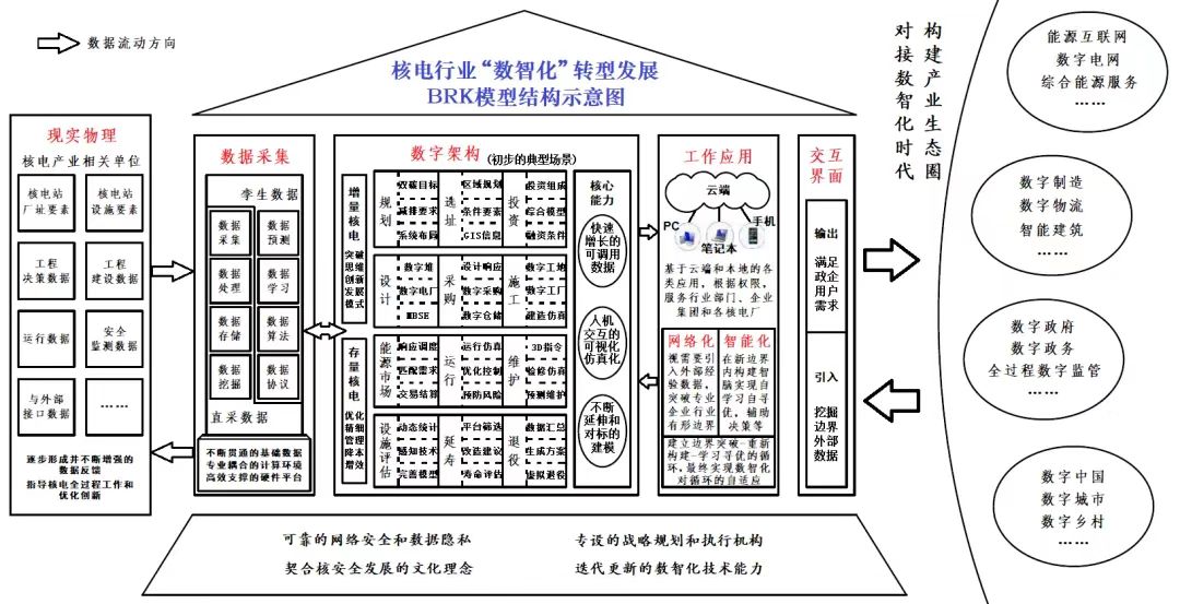 編者按:我國(guó)力爭(zhēng)2030年前實(shí)現(xiàn)碳達(dá)峰、2060年前實(shí)現(xiàn)碳中和,是黨中央經(jīng)過深思熟慮作出的重大戰(zhàn)略決策,事關(guān)中華民族永續(xù)發(fā)展和構(gòu)建人類命運(yùn)共同體。能源領(lǐng)域碳排放總量大、占比高,是實(shí)現(xiàn)綠色低碳轉(zhuǎn)型和高質(zhì)量發(fā)展的關(guān)鍵。公司能源業(yè)務(wù)部成立了以部門領(lǐng)導(dǎo)為龍頭、以青年黨員為骨干的“3060”研究小組,貫徹新發(fā)展理念和能源安全新戰(zhàn)略,對(duì)以新能源為主體的新型電力系統(tǒng)、碳排放和水電、新能源、核電、儲(chǔ)能、煤炭等方面高質(zhì)量發(fā)展進(jìn)行了探索性研究,以推動(dòng)構(gòu)建清潔低碳安全高效的能源體系。為促進(jìn)研究成果的應(yīng)用,本公眾號(hào)將核心研究成果以系列文章的形式陸續(xù)刊發(fā),供業(yè)界同仁參考。 “兩個(gè)構(gòu)建”背景下核電“數(shù)智化”發(fā)展思路與路徑研究 黃文 丁嵐 柴進(jìn)進(jìn) 摘要:在我國(guó)能源和電力產(chǎn)業(yè),“數(shù)智化”因?qū)δ茉匆嘏渲眯蕛?yōu)化、供需匹配協(xié)調(diào)、綜合能效提升乃至“兩個(gè)構(gòu)建”實(shí)施成效的關(guān)鍵作用,長(zhǎng)期以來備受各方關(guān)注。但在核電領(lǐng)域,對(duì)于“數(shù)智化”發(fā)展總體目標(biāo)和實(shí)施路徑的研究一直被忽視。鑒于此,本文在總結(jié)相關(guān)行業(yè)經(jīng)驗(yàn)的基礎(chǔ)上,總結(jié)提出核電“數(shù)智化”發(fā)展的總體目標(biāo)及相關(guān)要素,并以當(dāng)前我國(guó)核電發(fā)展現(xiàn)狀及“數(shù)智化”的關(guān)鍵需求為切入點(diǎn),探討形成了近期我國(guó)核電“數(shù)智化”發(fā)展實(shí)施路徑。 關(guān)鍵詞:核電;“數(shù)智化”;總體目標(biāo);BRK模型;發(fā)展路徑 一、引言 當(dāng)前我國(guó)能源和電力產(chǎn)業(yè)正在經(jīng)歷“百年未有之大變局”,在國(guó)家“碳達(dá)峰、碳中和”重大戰(zhàn)略決策指導(dǎo)下,以“兩個(gè)構(gòu)建”(構(gòu)建清潔低碳安全高效的能源體系、構(gòu)建新能源占比逐漸提高/以新能源為主體的新型電力系統(tǒng))為重點(diǎn)任務(wù)的能源綠色低碳轉(zhuǎn)型行動(dòng)正穩(wěn)步推進(jìn)[1]。總結(jié)世界能源低碳轉(zhuǎn)型的歷史經(jīng)驗(yàn),其往往與科技革命相伴相生、融合并進(jìn),以工藝技術(shù)的不斷創(chuàng)新和產(chǎn)業(yè)模式的升級(jí)再造等,在能源低碳轉(zhuǎn)型同時(shí)實(shí)現(xiàn)效率提升,推進(jìn)社會(huì)生產(chǎn)力發(fā)展[2]。如能源從木柴到煤炭、煤炭到石油及電力的低碳轉(zhuǎn)型分別與兩次革命中蒸汽機(jī)以及內(nèi)燃機(jī)、發(fā)電機(jī)的發(fā)明和廣泛應(yīng)用密不可分[3]。 目前,全球新一輪科技革命正當(dāng)其時(shí),以大數(shù)據(jù)、云計(jì)算、物聯(lián)網(wǎng)、移動(dòng)互聯(lián)網(wǎng)、人工智能等為代表的“數(shù)智化”(數(shù)字化、網(wǎng)絡(luò)化、智能化)技術(shù)及產(chǎn)業(yè)正不斷壯大,已實(shí)際成為這一輪變革的核心驅(qū)動(dòng)和關(guān)鍵內(nèi)容。在我國(guó),“數(shù)智化”技術(shù)也在全面滲透基礎(chǔ)工業(yè)及經(jīng)濟(jì)社會(huì)發(fā)展,不僅全面影響和改變了人們的生產(chǎn)生活方式,并已催生和推動(dòng)我國(guó)數(shù)字經(jīng)濟(jì)向更繁榮、更深化和更規(guī)范的階段發(fā)展[4]。 在我國(guó)能源和電力產(chǎn)業(yè),“數(shù)智化”也因?qū)δ茉匆嘏渲眯蕛?yōu)化、供需匹配協(xié)調(diào)、綜合能效提升乃至“兩個(gè)構(gòu)建”實(shí)施成效的關(guān)鍵作用,長(zhǎng)期以來備受各方關(guān)注。圍繞如何通過“數(shù)智化”發(fā)展促進(jìn)我國(guó)能源低碳轉(zhuǎn)型,不少學(xué)者及相關(guān)機(jī)構(gòu)已開展了大量研究。具體研究分為三類,第一類是以能源互聯(lián)網(wǎng)框架下的綜合能源系統(tǒng)為載體,聚焦“數(shù)智化”技術(shù)對(duì)多能源參與調(diào)節(jié)的支撐作用[5-7],保障能源安全供應(yīng)和高效匹配;第二類是以“雙碳目標(biāo)”下新型電力市場(chǎng)為載體,研究能源系統(tǒng)和市場(chǎng)數(shù)據(jù)的互聯(lián)互通、有機(jī)耦合[8-10],實(shí)現(xiàn)系統(tǒng)能效和市場(chǎng)績(jī)效提升;第三類則從“數(shù)智化”自身出發(fā),對(duì)在能源各行業(yè)的相關(guān)理念、關(guān)鍵技術(shù)及應(yīng)用前景進(jìn)行闡述[11-13]。目前這些研究多關(guān)注于能源流通和消費(fèi)領(lǐng)域,如電網(wǎng)和電力市場(chǎng),生產(chǎn)領(lǐng)域則以火電、可再生能源或圍繞其建立的綜合能源系統(tǒng)為主要研究對(duì)象,如“源網(wǎng)荷儲(chǔ)”“風(fēng)光水火儲(chǔ)”等,對(duì)核電“數(shù)智化”發(fā)展的研究分析相對(duì)較少。 現(xiàn)有對(duì)核電“數(shù)智化”發(fā)展的研究,集中在各核電集團(tuán)運(yùn)行技術(shù)部門或核電運(yùn)營(yíng)單位開展。如汪映榮、徐國(guó)彬、伍吉澤和干依燃等[14-17]分別論述了數(shù)字化核電廠的定義、5層模型、功能架構(gòu)和關(guān)鍵技術(shù)等。潘保林、王謙和張陸洋等[18-20]分別研究分析了數(shù)字孿生、智能技術(shù)和5G通信技術(shù)等在