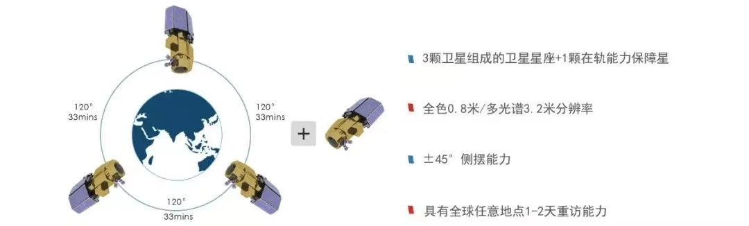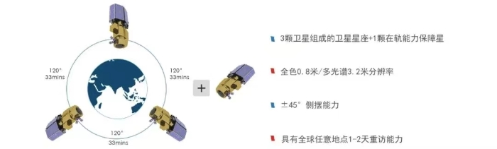 國家民用空間基礎設施1米分辨率遙感業務衛星項目的主要建設內容是“北京二號”遙感衛星星座系統,具體包括3顆0.8米全色、3.2米多光譜分辨率的光學遙感衛星以及自主研建的地面系統。該星座系統具有高空間分辨率、高時間分辨率和高輻射分辨率特點,技術能力達到國際先進水平,能夠實現全球任意地點一到兩天觀測任務重訪,可面向全球提供高空間和高時間分辨率的衛星遙感大數據產品和空間信息綜合應用服務。