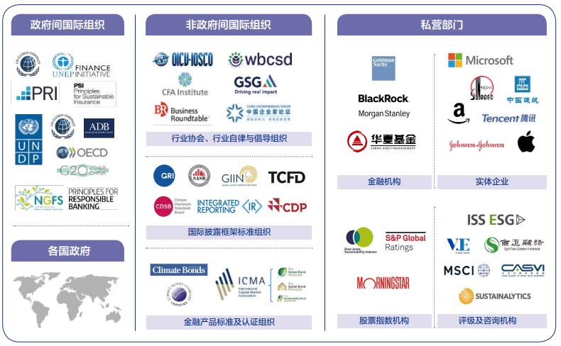 ESG理念和投資原則的迅速傳播和應用,關鍵在于政府間國際組織、非政府間國際組織、公共部門和企業等多元主體共同參與。聯合國系統的13家機構或倡議組織(包括UNCTAD、ITC、UNDP、UNEP、WBG、IFC、IMF、UN SSE、UNEP FI、PRI、PSI、PRB、UNGC 等),經濟合作與發展組織(OECD)、二十國集團(G20)等重要的國際多邊合作組織,都積極推動ESG政策的制定實行,以亞洲開發銀行(ADB)為代表的各地區開發銀行也紛紛加強對可持續領域的項目投資力度,推動地區可持續發展目標的實現。在各類國際組織、政府監管部門、金融機構和實體企業等共同推動下,ESG逐漸走向標準化、國際化、體系化、全面化,成為了國際資本市場的一種“新規則”。
