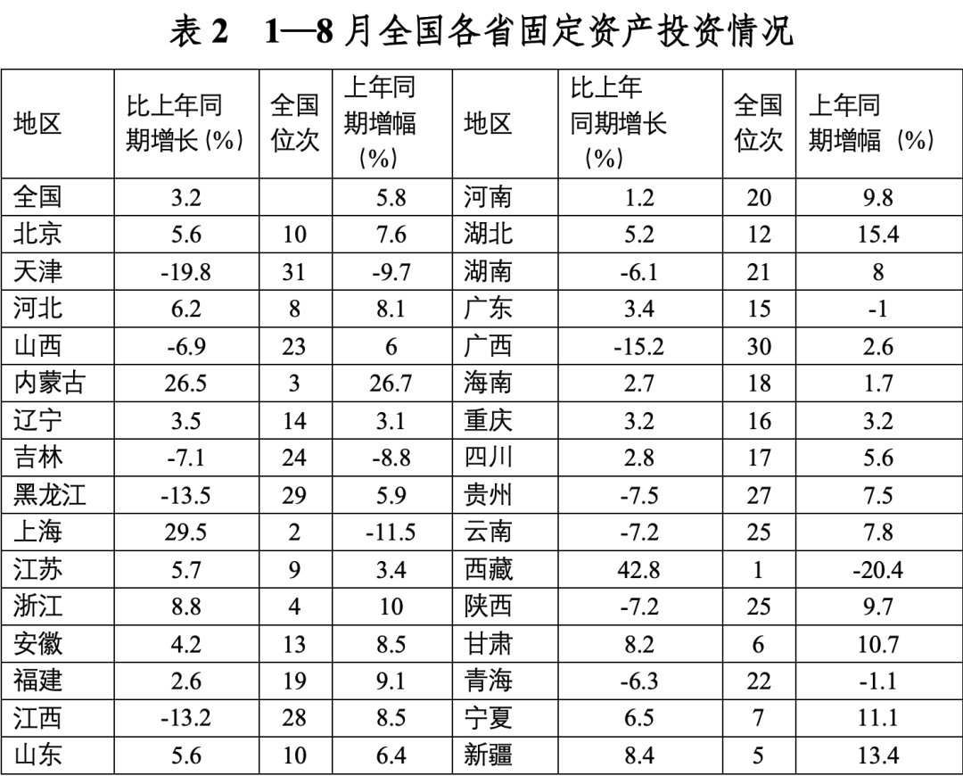 2023年前三季度,我國經濟運行持續恢復向好,投資對優化供給結構的關鍵作用顯著增強,高技術產業投資保持較快增長,基礎設施投資、制造業投資穩投資支撐作用進一步發揮。同時,當前穩投資也面臨新的困難挑戰,尤其是房地產市場深度調整導致房地產開發投資和民間投資承受較大下行壓力。下一步仍需精準有力加強逆周期調控,不斷拓展促投資政策空間,重點圍繞提振房地產市場、推動制造業轉型升級、激發民間投資活力等方面,繼續夯實投資復蘇基礎。 一、固定資產投資整體運行情況 (一)整體投資保持平穩增長態勢 2023年1—9月,我國固定資產投資(不含農戶,下同)375035億元,同比增長3.1%,較國內生產總值增速低了2.1個百分點,較上半年增速低了0.7個百分點,固定資產投資增速持續放緩。從投資構成看,上半年建安工程、設備工器具購置、其他費用分別增長2.4%、6.8%、3.1%。設備工器具購置保持較快增長,反映在各類政策工具支持引導下,企業設備購置、技術改造投入力度加大。 圖1 全國固定資產投資增速(%) 數據來源:國家統計局 (二)民間投資意愿和能力仍待恢復 2023年1—9月,民間固定資產投資為193399億元,同比下降0.6%,較上半年低了0.4個百分點,低于投資整體增速3.7個百分點。從季度波動看,民間固定資產投資的增速由2022年第一季度的8.4%持續下滑,并連續兩個季度負增長。民間固定資產投資占比進一步萎縮,跌至2011年以來的最低點,僅為51.57%。 圖2 民間投資增速及占比(%) 數據來源:國家統計局,Wind數據庫 國家統計局發布信息顯示,房地產投資中約80%為民間投資。受房地產市場深度調整影響,民間投資動力和能力相對不足,國有及國有控股單位投資增速連續20個月高于民間投資增速。2023年1—9月,國有及國有控股單位同比增長7.2%,較民間投資增速高了7.8個百分點。 圖3 民間投資、國有及國有控股單位投資增速(%) 數據來源:國家統計局,Wind數據庫 (三)制造業投資保持較快增長,基礎設施補短板投入加大 2023年1—9月,制造業和基建投資保持較快增長,房地產投資持續負增長,且降幅有所擴大。基礎設施投資在專項債等融資支持政策以及重大項目支撐下,效果持續顯現,前三季度基礎設施投資同比增長8.64%,高于全部投資5.54個百分點,是三大類投資中增長最快的領域。其中,鐵路運輸業、倉儲業投資分別大幅增長22.1%、27.7%。截至9月底,新增地方政府專項債已發行超過3.1萬億元,完成全年專項債額度的80%以上,對基礎設施投資形成較強支撐。1—9月份,計劃總投資億元及以上項目投資同比增長10.2%,較1—8月快了0.3個百分點,對全部投資增長的貢獻率達169.2%,大項目投資帶動作用明顯。 數據來源:國家統計局,Wind數據庫 2023年1—9月,制造業投資同比增長6.2%,比整體投資高3.1個百分點。其中,高技術制造業投資同比增長11.3%,對制造業投資拉動作用明顯,表明我國制造業加速轉型升級。9月,制造業采購經理指數(PMI)為50.2%,比上月上升0.5個百分點,重返擴張區間。生產指數和新訂單指數均高于臨界點,分別為52.7%和50.5%,表明制造業生產和市場需求穩步回升。裝備制造業、高技術制造業PMI分別為50.6%、50.1%,均位于擴張區間。從企業規??矗?、中、小型企業PMI分別為51.6%、49.6%和48%,其中大型企業PMI較上月回升0.8個百分點,為近6個月高點,表現出強勁恢復發展動能。 圖4:制造業PMI指數(%) 數據來源:國家統計局,Wind數據庫 2023年1—9月,房地產開發投資增速持續放緩,房地產開發投資、住宅開發投資分別同比下降9.1%、8.4%。房地產開發投資占固定資產投資完成額的比重降至23.3%,較上半年下降0.8個百分點,為今年以來最低值。房屋施工面積、房屋新開工面積等先行指標均出現明顯下滑,分別同比下降7.1%、23.4%。1—9月,國房景氣指數均位于100以下,自4月以來持續走低。 圖5 三大領域固定資產投資增速(累計同比,%) 數據來源:國家統計局,Wind數據庫 (四)東部地區投資保持較快增長,東北地區投資下滑明顯 從投資地域看,三季度東北地區投資轉為負增長,1—9月累計同比下降2.7%,較全國水平低了5.8個百分點。東部地區投資同比增長5.4%,保持較高增速。西部地區投資同比微降0.4%,增速由正轉負。中部地區投資同比下降0.9%,降幅較上半年收窄0.8個百分點。 圖6 分地區固定資產投資增速(累計同比,%) 數據來源:國家統計局,Wind數據庫 1—8月,31個省份中有15個省投資增速高于全國水平,其中西藏、上海、內蒙古等3省實現兩位數增長,增速分別達42.8%、29.5%、26.5%,投資恢復動力較強。天津、山西、吉林、黑龍江、江西、山東、湖南、廣西、貴州、云南、陜西、青海等12省出現負增長,其中天津、廣西、黑龍江、江西降幅最大,分別同比下降19.8%、15.2%、13.5%、13.2%。 數據來源:國家統計局,Wind數據庫 二、主要問題 (一)房地產投資持續低迷加劇市場信用風險 一是房企信用風險增加制約融資能力。房企普遍采取的高負債、高周轉運營模式,積累了較高的杠桿風險,房地產開發項目存量資產普遍存在融資抵押且抵押率較高的情況,導致房地產債務重組等風險化解方式推進困難,房企的信用修復過程緩慢,進一步導致融資困難。1—9月,房地產開發企業國內貸款和自籌資金分別同比下降11.1%和21.8%。二是房企流動性風險向產業鏈上下游傳導。房地產業涉及行業多、產業鏈條長,行業不景氣間接拖累了上下游民營企業投資。恒大、碧