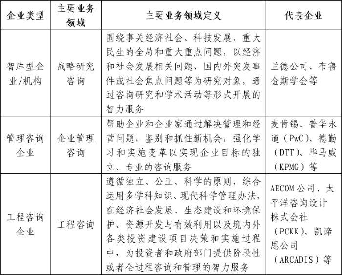 中咨公司與世界一流咨詢企業對比研究 中咨公司“青馬工程”第四小組 陳佳鵬 譚瀟 王晶晶 等 一、研究背景 (一)研究目的 黨的二十大報告提出,要“深化國資國企改革,加快國有經濟布局優化和結構調整,推動國有資本和國有企業做強做優做大,提升企業核心競爭力”“完善中國特色現代企業制度,弘揚企業家精神,加快建設世界一流企業”,這些都為國資國企以實際行動全面建設社會主義現代化國家、以中國式現代化推進中華民族偉大復興提供了根本遵循。 《國企改革三年行動方案(2020-2022年)》和《關于開展對標世界一流管理提升行動的通知》(國資發改革〔2020〕39號),要求中央企業要對標世界一流企業,通過管理提升,建設成為具有全球競爭力的企業。中國國際工程咨詢有限公司(以下簡稱中咨公司)“十四五”規劃明確提出,未來發展要聚焦于實現建成國家高端智庫和世界一流咨詢機構的戰略目標,指明了公司的前進方向。 為深入貫徹黨的二十大報告關于國資國企改革發展和黨的建設的重大部署,認真落實國務院國資委關于中央企業對標世界一流管理提升改革行動計劃的相關部署和中咨公司“十四五”發展規劃,以推動公司高質量發展為主題,以改革創新為根本動力,緊扣“加快建設世界一流咨詢機構”目標,通過選取咨詢領域有較強影響力的標桿企業開展對比研究,提出中咨公司建設世界一流咨詢機構的戰略構想,進一步搶抓高質量發展的重要戰略機遇期。 (二)對比范圍 基于中咨公司業務范圍與自身戰略規劃,本次研究將重點選取全球領先的智庫型企業、管理咨詢企業、工程咨詢企業進行對比研究。 表1 三類咨詢企業分類一覽表