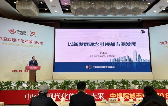 2024年10月16日,應中國城市規劃設計研究院(以下簡稱中規院)邀請,中咨公司黨委委員、副總經理潘小海代表公司參加“中國式現代化的城市未來——中規院城市規劃70年學術活動”,并圍繞會議主題“新型城鎮化與區域協同發展”,作題為“以新發展理念引領都市圈發展”的主旨演講。