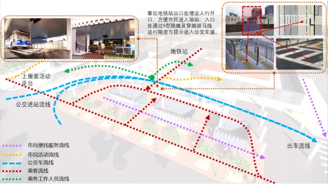場站內部交通流線的梳理,打破原有場站邊界,從出地鐵站口增設人行開口方便換乘、過站市民進入。與公交車行道交叉處通過S型路障、鋪設斑馬線等措施進行限流與提示,解決原場站阻礙換乘人流的問題。