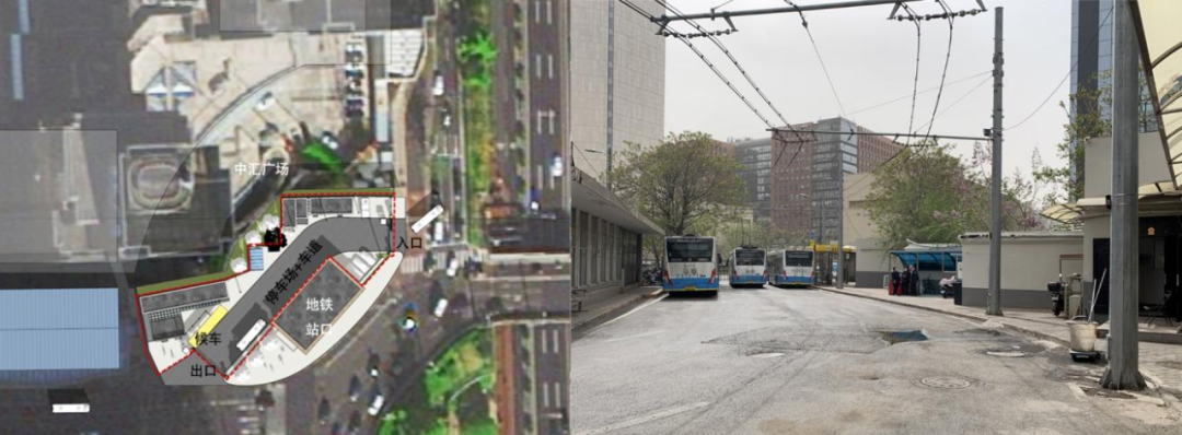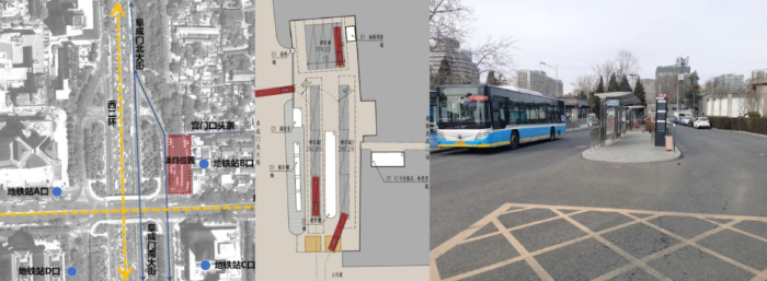 東城區二環西側的東城試點場站,是所在街道的東南門戶,位于歷史文化街區以外東側古都風貌協調區內,夾在用地南側地鐵出站口與西北側高層建筑前廣場間的狹長帶狀場地內。場站與東側現代風貌控制區相望。東、南及東南三面均為十字路口街角的現代風貌高層建筑。