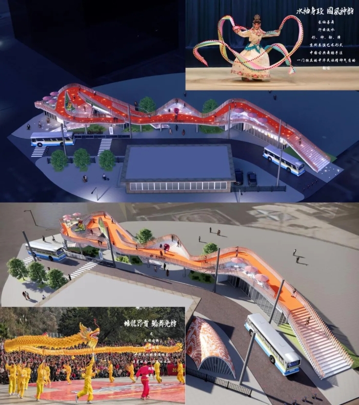 城市區位上,場站內外的現有屏障墻全部拆除向市民開放,成為聯結北側高層建筑前廣場與地鐵站口的紐帶與橋梁。兩側站務用房之間及候車站臺區通過增設立柱,架起契合用地紅線的二層廊橋相連通,開敞的下方供行人穿行。整體形象猶如節日慶典上舞龍桿揮舞蜿蜒盤旋的金色蟠龍,意喻團結、統籌起周邊的地鐵、高層廣場,凝聚人氣上“龍背”。通過場站—城市一體化設計,既順應空間共融服務共享理念,提升整體效益,也縮短了換乘距離。