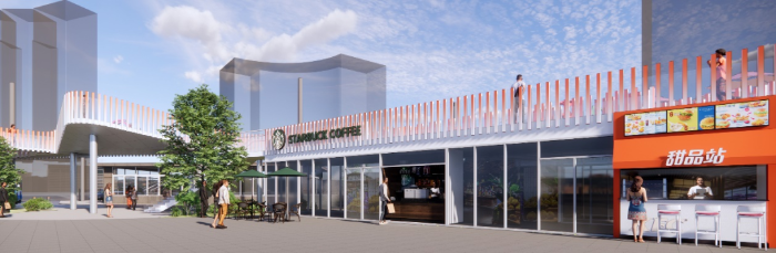 原場站服務用房貼臨的北側屏蔽圍墻是商業及便民服務的主要制約條件。通過屏蔽墻的拆除,使得整個場站北側界面以開放姿態面向身后高層建筑前廣場。服務功能用房優化整合集中在場站東側,通過將更貼臨高層建筑前廣場的西側場站房屋的界面進行通透化的處理,增加便民服務商業網點,貼紅線開啟的服務窗口直接面向廣場人流,進一步增強地塊之間的開放、融合與共享,重新激發城市應有的活力。