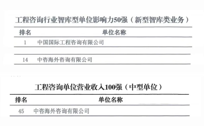 2024年11月,中國工程咨詢協會發布2023年度工程咨詢單位排名,海外公司名列工程咨詢行業智庫型單位影響力50強第14名、工程咨詢單位營業收入100強(中型單位)第45名,品牌聲譽和口碑持續彰顯。