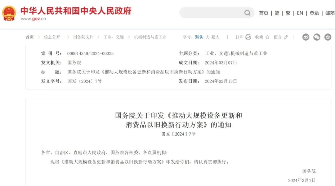 近日,國務院印發《推動大規模設備更新和消費品以舊換新行動方案》(國發〔2024〕7號,以下簡稱7號文),重點實施設備更新、消費品“以舊換新”、回收循環利用、標準提升四大行動,并明確提出加大財政政策支持力度和優化金融支持,為大規模設備更新和消費品“以舊換新”提供堅實有效的政策保障。