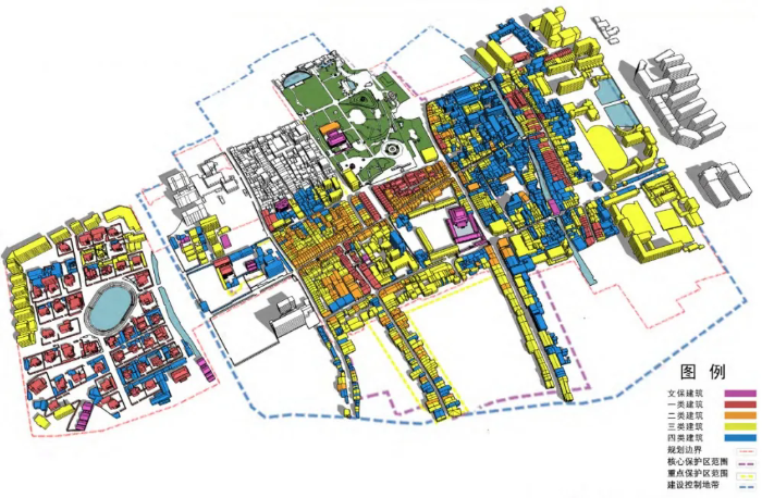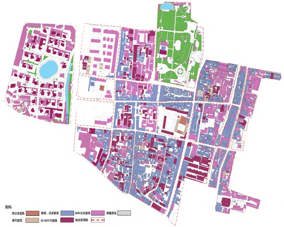 對現狀歷史建筑的建筑風貌、建筑質量、歷史意義等因素進行評估,將建筑分為文保建筑、一類建筑、二類建筑、三類建筑、四類建筑五類。其中,文保建筑為極具歷史價值、意義重大的建筑;一類建筑為風貌完好、質量上佳的建筑;二類建筑為風貌尚可、質量稍差的建筑;三類建筑為風貌較差、質量不佳的建筑;四類建筑為風貌極差、質量極差的建筑。可以看到,古城中心區內歷史建筑整體保存較好,外圍區域保存較差,可有針對性地進行建筑風貌恢復、整理工作。
