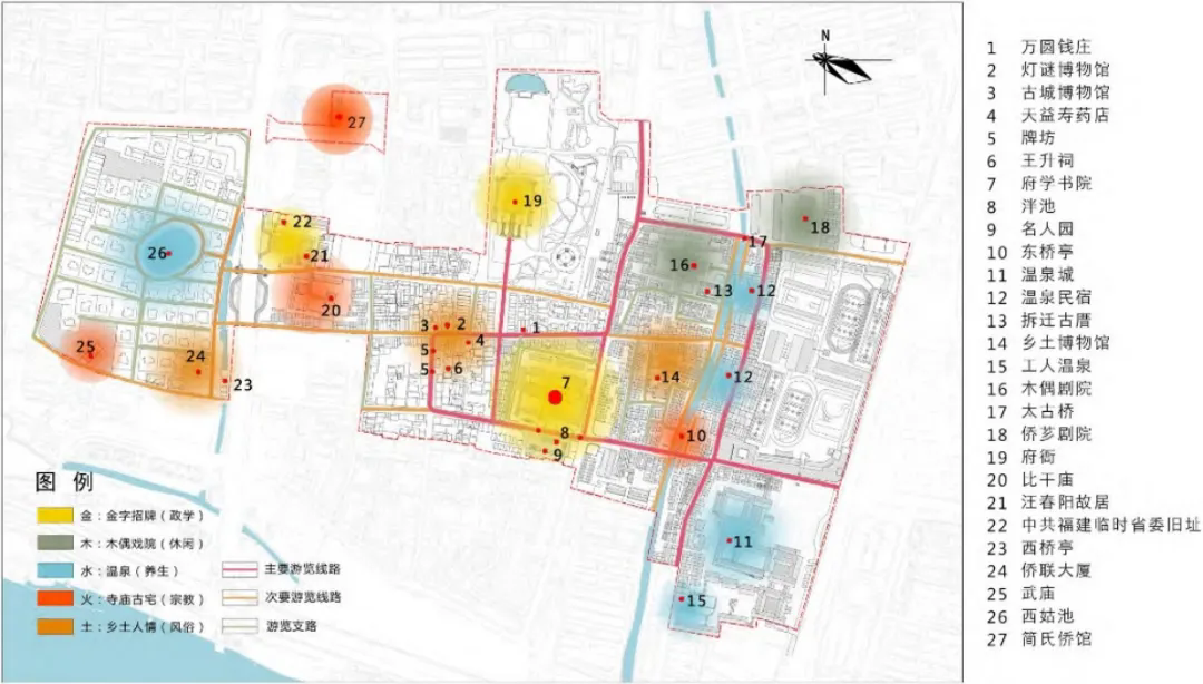 深入挖掘漳州古城內歷史文化資源,保留漳州古城整體風貌與建筑特色,進行改造升級。首先,梳理古城內歷史建筑,識別和提取其中蘊含的金、木、水、火、土文化基因[8],進行保護、修繕和再利用。其中,金主要為府衙、文廟等政府和文化建筑,木主要為木偶戲院等休閑建筑,水主要為溫泉等養生建筑,火主要為寺廟古宅等宗教建筑,土主要為體現鄉土人情的風俗建筑。其次,對服務、餐飲、購物等傳統業態進行升級,并植入展覽、體驗等新興業態。最后,組織主要和次要游覽線路。從點、線、面三個不同層次實現整個古城的活化與發展(圖7),最終將其打造成為閩南地區的特色文化名片。
