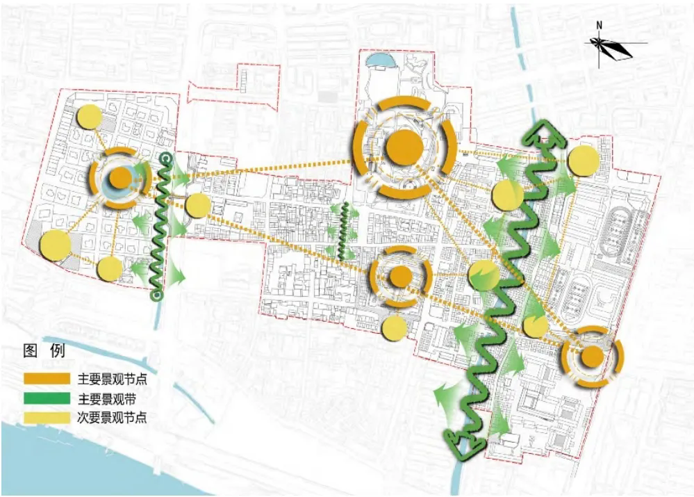 提取宋河在漳州古城歷史演變中的重要組成要素,充分利用宋河水系兩岸景觀及豐富的地熱溫泉資源,亮出宋河沿岸景觀,并通過打造溫泉體驗特色聚集人氣,重現“至誠無息,博厚悠遠”的宋河古韻。以中山公園、僑村西姑池、文廟等主要景觀要素形成主要景觀節點,結合街巷空間和開放空間形成次要景觀節點,強化宋河兩岸的景觀空間營造形成景觀帶,以主帶次、點帶連片,形成相互聯系、相互滲透的有機景觀結構系統(圖9)。
