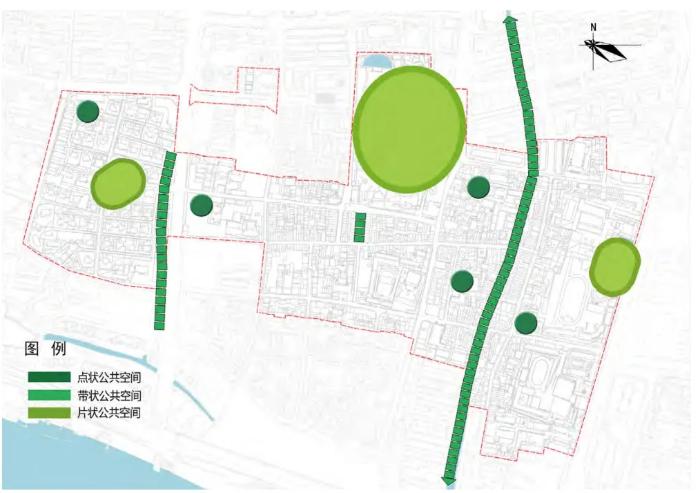 古城臨近宋河水系,周邊有山體公園、濱江公園以及小游園,開放空間類型較豐富(圖4)。目前只有中山公園的1公里服務范圍全覆蓋了古城規劃地區,基本滿足“500米見綠、1000米達園”的綠地布局要求,和構建“園在城中、城在園中、城園一體、園城共融”的現代田園型都市的目標。