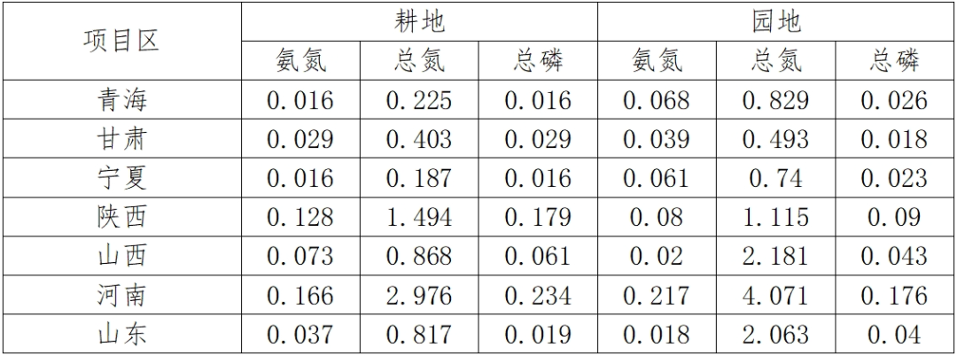 項(xiàng)目區(qū)主要作物包括小麥、玉米、馬鈴薯、蔬菜以及蘋果、梨等,種植面積共3.90萬hm2。根據(jù)生態(tài)環(huán)境部制定的《排放源統(tǒng)計(jì)調(diào)查產(chǎn)排污核算方法和系數(shù)手冊(cè)》,種植業(yè)水污染物(氨氮、總氮、總磷)流失量采用產(chǎn)排污系數(shù)法核算,等于農(nóng)作物總播種面積、園地面積與相應(yīng)污染物排放系數(shù)以及當(dāng)年種植業(yè)含氮化肥或含磷化肥單位面積使用量與項(xiàng)目實(shí)施前現(xiàn)狀種植業(yè)含氮化肥或含磷化肥單位面積使用量的比值(計(jì)算總氮和氨氮時(shí)用含氮化肥用量、計(jì)算總磷時(shí)用含磷化肥用量)相乘,某項(xiàng)污染物排放(流失)量的計(jì)算公式如下,種植業(yè)氮磷流失系數(shù)見表1[16]