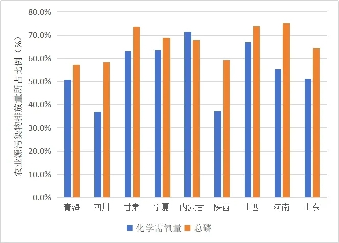 根據(jù)各省區(qū)第二次全國(guó)污染源普查公報(bào),黃河流域大部分省區(qū)化學(xué)需氧量和總磷污染物排放源自農(nóng)業(yè)源污染的比例超過50%,內(nèi)蒙古農(nóng)業(yè)源產(chǎn)生的化學(xué)需氧量污染物以及甘肅、山西、河南農(nóng)業(yè)源產(chǎn)生的總磷污染物排放占全省污染物排放量的比例甚至超過70%(見圖2)[7-15]