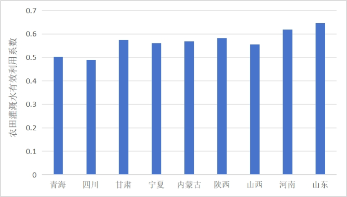 農(nóng)業(yè)是黃河流域的用水大戶,根據(jù)2021年中國(guó)水資源公報(bào)[4],農(nóng)業(yè)用水占用水總量的63.0%,而農(nóng)業(yè)用水的90%以上是農(nóng)業(yè)灌溉用水,但目前流域灌溉用水效率總體不高,部分省的農(nóng)田灌溉水有效利用系數(shù)低于全國(guó)平均水平(0.568)和發(fā)達(dá)國(guó)家平均水平(0.7)(見圖1)。單方灌溉水的產(chǎn)糧數(shù)大約為1.5kg,與發(fā)達(dá)國(guó)家相比也偏低[3]