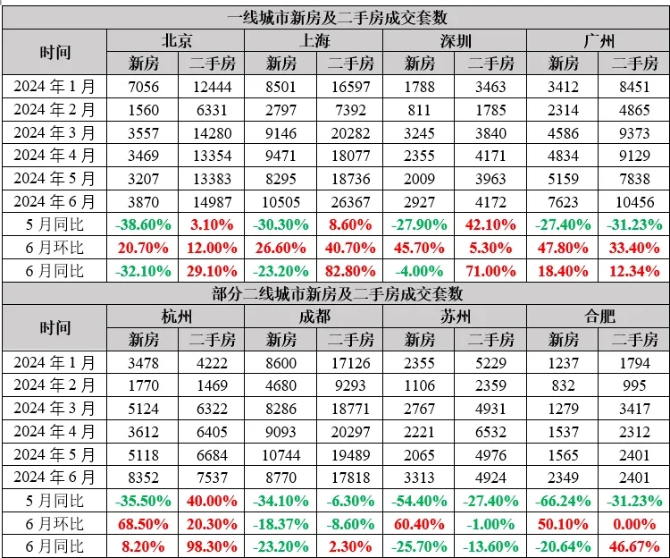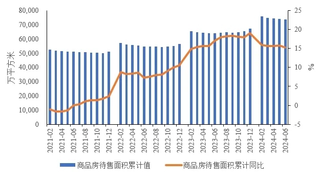 2024年上半年,房地產行業基本面仍處于下行階段,但得益于短期從中央到地方利好新政刺激,銷售面積、金額同比降幅略有收窄,新開工、竣工止跌企穩,6月市場開始出現“筑底”信號,但這不是拐點信號,市場仍處于下行階段。2024年1-6月,全國商品房銷售面積4.79億平米,同比下降19.0%;商品房銷售額4.71萬億元,同比下降25.0%;從6月單月數據來看,商品房銷售面積為1.13億平方米,環比上漲52.5%;商品房銷售額為1.15萬億元,環比上漲50.9%。截至2024年6月末,商品房待售面積73894萬平方米,同比增長15.2%,其中,住宅待售面積增長23.5%,庫存壓力嚴峻。1-6月,中指355城住宅土地成交面積和金額分別同比下降38.1%和44.3%;房屋新開工面積3.80億平方米,同比下降23.7%;房屋竣工面積2.65億平方米,同比下降21.8%。本輪房地產去庫存面臨更大壓力,去化周期2024年6月已達到23.8個月。房價深度調整,截至2024年6月連續26個月負增長,根據中原領先指數可知,目前一線城市二手房房價平均降幅達25%。國家金融監管總局數據顯示,今年5月份首套房貸平均利率3.45%,二套房貸平均利率3.9%,分別比上年同期下降0.55和1個百分點,達到2008年以來的最低值。