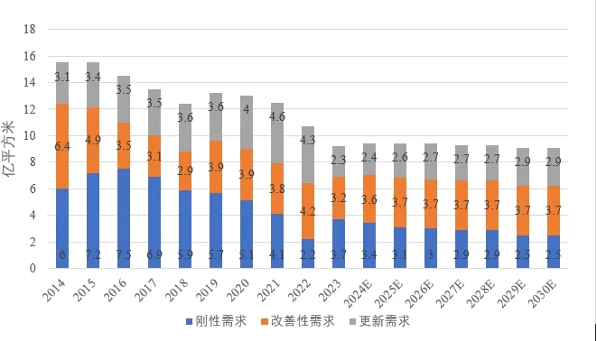 02 我國新增商品房需求將呈現“L”型回落趨勢,預計年均新增需求中樞約為9.3億平方米,需求增速中樞為-3.6%,投資增速中樞為-1.4%