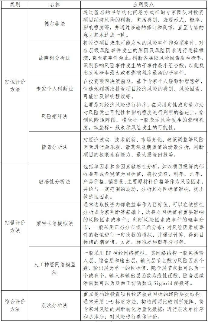 投資項目經濟風險分析評價是在對項目全生命周期可能面臨的經濟風險因素或風險事件進行全面分析評價的基礎上,編制項目風險清單,并按照重要性進行排序,其基本原則和常用分析評價方法應用要點如下: