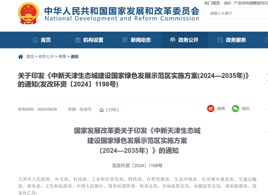 近日,經國務院批復同意,國家發展改革委印發《中新天津生態城建設國家綠色發展示范區實施方案(2024—2035年)》(發改環資〔2024〕1198號,以下簡稱《方案》),立足新形勢新要求,從多個維度對下一階段中新天津生態城(以下簡稱生態城)建設國家綠色發展示范區升級版的目標任務作出了全面系統部署。