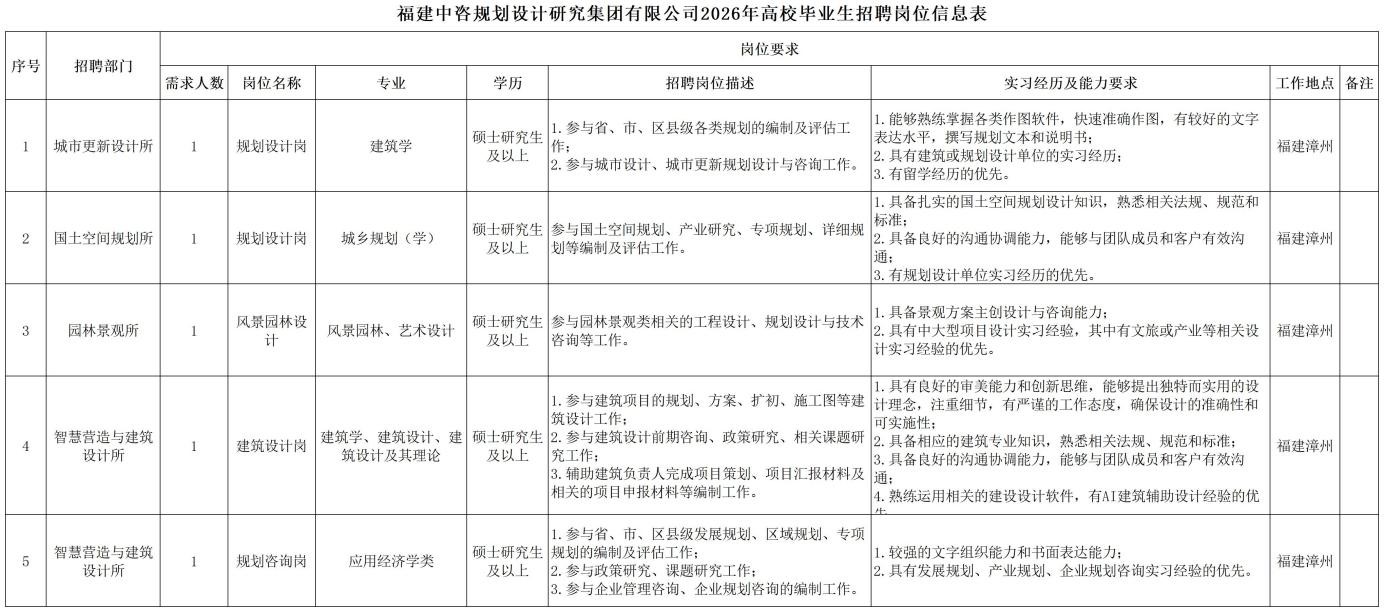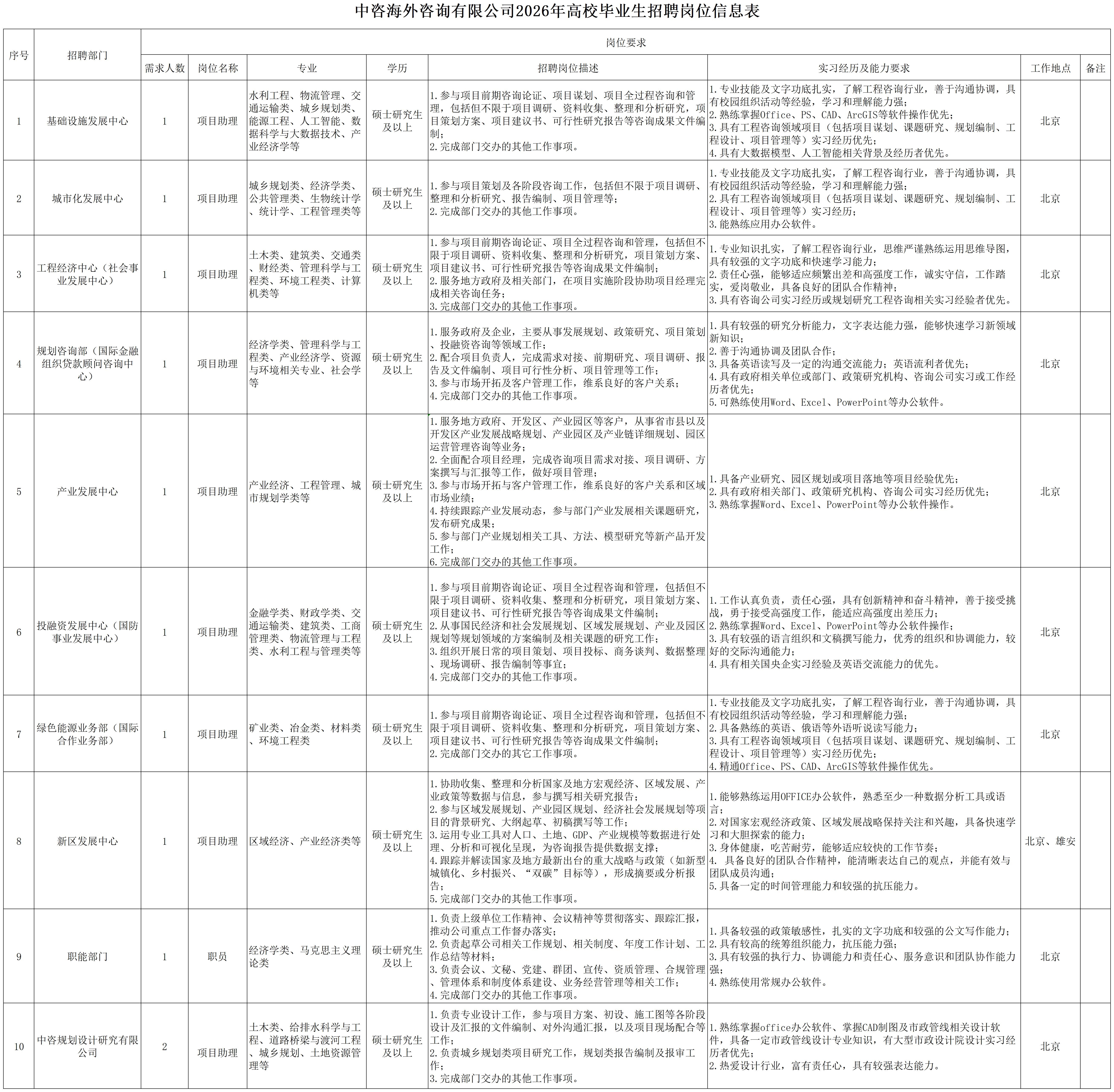 一、公司簡介 中咨工程管理咨詢有限公司(簡稱中咨管理)成立于1989年,是中國國際工程咨詢有限公司的核心骨干子公司,注冊資金1.55億元。現有各項資質證書持證2800余冊,中高級職稱比例超50%。 中咨管理公司是國內從事工程管理類業務最早、規模最大、行業最廣、業績最多的企業之一,具有工程咨詢甲級資信、工程監理綜合資質以及設備、公路工程、地質災害防治工程、人民防空工程等多項專業監理甲級資質,并列入政府采購招標代理機構和中央投資項目招標代理機構名單。業務涵蓋工程前期咨詢、項目管理、項目代建、招標代理、造價咨詢、工程監理、設備監理、設計優化、工程質量安全評估咨詢等項目全過程咨詢服務,涉及房屋建筑、交通、石化、水利、電力、冶煉、礦山、市政、生態環境、通信和信息化等多個行業。業務遍布全國及全球近50個國家和地區,累計服務各類咨詢管理項目超過1萬個,涉及工程建設投資近5萬億元。曾榮獲56項中國建設工程魯班獎、15項中國土木工程詹天佑獎、64項國家優質工程獎、23項中國鋼結構金獎以及各類省級或行業獎項500余項。 經過30余年的不懈努力,我們積累了豐富的工程管理經驗,為各類工程建設項目保駕護航,“中咨管理”品牌成為行業的一面旗幟。我們崇尚簡單、包容、共享的理念,秉持創造價值、貢獻社會的使命和專業創造精品、價值成就客戶的核心價值觀,為成為全過程工程管理咨詢的領先者而奮斗。優秀的你值得更好的平臺,加入我們,攜手共創新篇章! 二、應聘條件 (一)2026年全日制本科及以上應屆畢業生。 (二)年齡要求:本科生26周歲及以下(2000年1月1日后出生),碩士研究生30周歲及以下(1996年1月1日后出生)。 (三)在校就讀期間無在職工作經歷,無社保繳納記錄和派遣落戶記錄。 (四)成績優秀,人品端正,積極進取,愿與公司共改革、奮進。 (五)具備扎實的專業理論知識和良好的溝通能力,實踐能力較強。 (六)熟練使用各類辦公軟件。 (七)簡歷需注明出生日期、生源地(即入學前戶籍所在地)。 三、應聘程序 發布招聘公告→簡歷投遞→簡歷篩選→筆試→面試→確定人選并公示→發放錄用通知。 四、崗位信息 五、報名方式 本次招聘報名采取在線填報方式進行:應聘者請使用Chrome內核瀏覽器(如:Chrome瀏覽器、360瀏覽器、百度瀏覽器、搜狗瀏覽器、UC瀏覽器等)登錄網站報名,網站鏈接:https://hcmcloud.ciecc.com.cn/recruit/#/index 或使用手機掃描二維碼: 中咨工程有限公司 一、 公司簡介 中咨工程有限公司成立于2010年,是中國國際工程咨詢有限公司(簡稱中咨公司)的控股子公司,由中咨公司和中國廣核電力股份有限公司合資成立。 公司作為中咨公司工程管理業務板塊的核心成員,主營業務為全過程工程管理(咨詢)服務業務,包括全過程中的各節點業務(1+X),業務范圍涉及石化、核電、冶金、交通和民用市政等多個領域行業工程項目的前期咨詢及咨詢管理、勘察管理、設計管理、監理、采購管理、造價咨詢、建造過程管理、項目管理(IPMT、PMC等)、項目代建和技術服務等。 公司以為國家、社會和股東創造價值為己任,以兩大股東提供的廣闊市場機遇和成熟先進的管理體系為發展驅動力,通過積極參與市場競爭,努力培育公司核心競爭能力,打造一支特別能戰斗的具有復合型人才的專業化隊伍,矢志發展成為具備承接大中型全過程工程管理(咨詢)服務業務能力的、具有國際競爭力的工程公司。 二、 應聘條件 (一)2026年全日制本科及以上應屆畢業生(部分崗位碩士研究生學歷),在校就讀期間無在職工作經歷,無社保繳納記錄和派遣落戶記錄,學習成績優良。 (二)良好的語言表達能力和溝通能力,執行力強,學習能力強,協作能力強。 (三)身體健康,具有良好的職業道德修養,具有較強的責任心。 (四)熟練使用常用辦公軟件,具有一定的文字功底。 (五)無違規違法記錄,無不良嗜好,身體素質好,能吃苦耐勞,能承受較大的工作壓力。 三、 招聘程序 發布招聘公告→簡歷篩選→資格審查→綜合能力測評→面試→確定人選并公示→發放錄用通知→入職。 四、 崗位信息 五、 報名方式 本次招聘報名采取在線填報方式進行:應聘者請使用Chrome內核瀏覽器(如:Chrome瀏覽器、360瀏覽器、百度瀏覽器、搜狗瀏覽器、UC瀏覽器等)登錄網站報名,網站鏈接:https://hcmcloud.ciecc.com.cn/recruit/#/index 或使用手機掃描二維碼: 中咨海外咨詢有限公司 一、公司簡介 中咨海外咨詢有限公司是中國國際工程咨詢有限公司所屬二級子公司,于1988年成立,經過30多年發展,為各級政府、企事業單位提供了萬余項咨詢服務,在國內咨詢領域具有一定知名度和較高信譽,具備較好的發展基礎。2021年入選國資委“管理標桿”企業,2022-2025年連續4年蟬聯國資委“雙百行動標桿”企業。 公司主要從事戰略謀劃、投資策劃、全過程咨詢以及規劃設計和建設投資管理經營五大業務。善于謀劃策劃創造發展新優勢,努力成為工程建設領域原創思想策源地;善于科學設計項目功能成本方案,致力成為國內優化設計領域先行者;善于系統提供區域發展整體解決方案,努力成為國內有影響力的具有研究特質的咨詢設計企業。公司為國家高新技術企業,擁有工程咨詢行業綜合甲級資信、15項專業專項甲級資信;公路、建筑、市政行業7項專業甲級設計資質;市政行業2項專業乙級設計資
