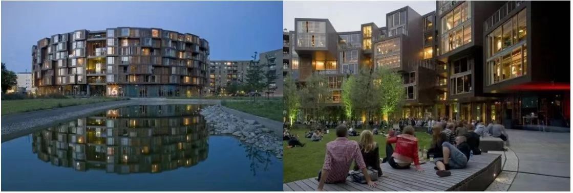 該學生公寓位于丹麥哥本哈根,建于2006年,總建筑面積26800㎡,提供了集居住、生活、休閑、學習于一體的多元化綜合體。創造了多種類型的戶型,滿足不同學生對公寓需求的差異性。公寓包含360間宿舍,戶型分為4種,分別為26㎡,29㎡,33㎡和42㎡。為了避免大學成為脫離社會的孤島,規劃設計時將學生公寓作為聯系大學與社會的節點,在個人表達與集體生活之間尋找平衡點,從而營造大家庭的氛圍。公用廚房、娛樂室、陽臺和輔助用房朝向庭院布置,居住用房朝向外側。建筑垂直劃分為5部分,每一部分包含12個居住單元。